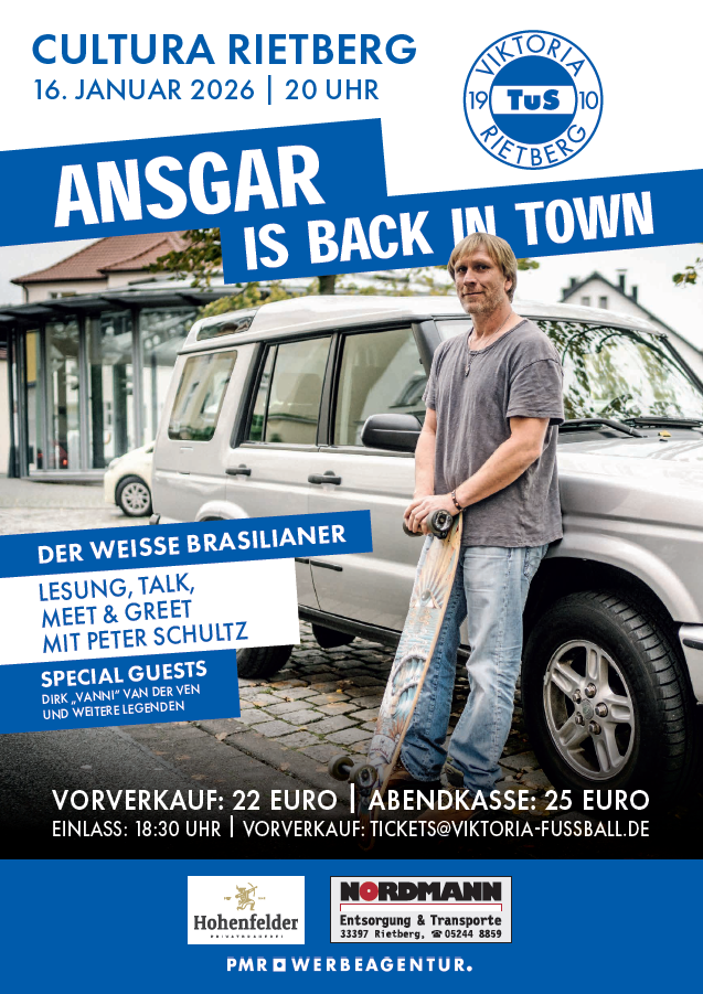 Am Freitag den 16. Januar 2026 ab 20 Uhr steht Ansgar Brinkmann „Der weiße Brasilianer“ wieder auf der Bühne der Cultura Rietberg mit seinem Writer Peter Schultz und Spezi Dirk van der Ven. Dazu wird Ansgar noch den ein oder anderen Überraschungsgast mitbringen.